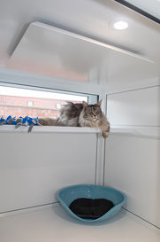 The thermostatically controlled sleep area is accessed by a choice of floor level or shelf level cat flaps and is 1.2m by 1.35m. There are two shelves and a high level viewing window. A cocoon bed (including soft bedding) and a litter tray is provided for each guest.